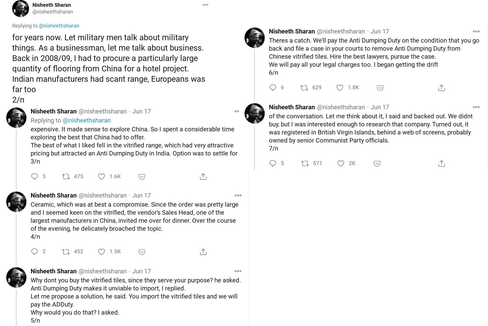 I came across these tweets from a business consultant named Nisheeth Sharan. He shares two anecdotes which are quite symptomatic of how Chinese companies and the Chinese Communist Party operates in the business sphere.