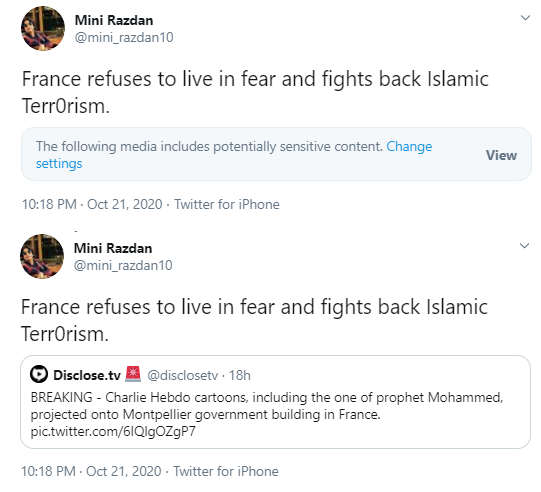 But Twitter hid it and tagged it as “potentially sensitive content.” When I clicked on “View”, it showed the news item related to the cartoons to be projected on the government building in France. No exaggeration. No opinion. Simply reporting of a decision by a progressive nation’s government.