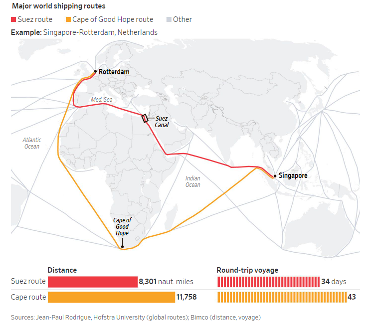 The alternative route of going around the Cape of Good Hope adds a week to the schedule. That in itself is a big loss.