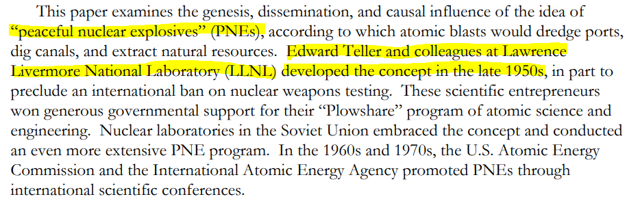 The oxymoronic concept of Peaceful Nuclear Explosives was developed by the Lawrence Livermore National Laboratory (LLNL) in the late 1950s.