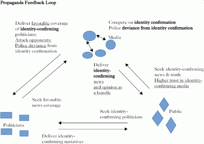 Propaganda as we define it in Chapter 1—the manipulation of public beliefs, attitudes, and behaviors for political ends, framed in terms that reinforce partisan narratives—is much easier to insert into a system whose audiences, outlets, and elites have nothing to gain by disputing or disbelieving it and everything to lose by doing so, and will survive longer and propagate further in it. The network takes these inputs and converts them into a partisan package delivered to its various constituents: a steady flow of bias-confirming stories that create a shared narrative of the state of the world; a steady flow of audiences, viewers, or clicks for the outlets; and a steady flow of voters highly resilient to arguments made by outsiders on outlets that are outside the network. Outlets within the network are not designed to check or refute propaganda as long as it is consistent with the partisan narrative. There is nothing to gain and everything to lose. (Source - OxfordUniversity)