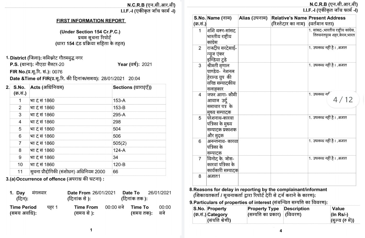 On Jan 28th, an FIR was filed in Uttar Pradesh against Shashi Tharoor, Rajdeep Sardesai, Mrinal Pandey, and editors of Caravan magazine for spreading fake news and provoking communal violence.