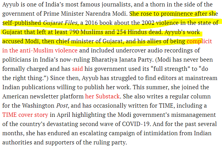 Then the article builds a narrative of how she is being hounded. The build-up of that spin starts, of course, with her book “The Gujarat Files”. Time article heralds her as a fearless independent journalist who self-published a book against Modi for the 2002 Gujarat riots.
