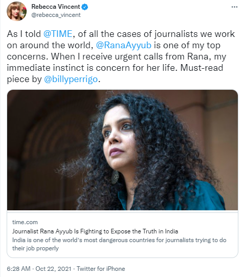 As for Rana Ayyub, she is given a further coat of victimhood merged with hero status by Rebecca Vincent, the Director of International Campaigns and UK Bureau Director of Reporters Without Borders (RSF).