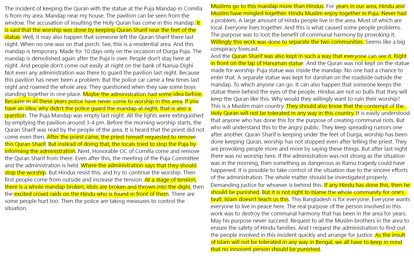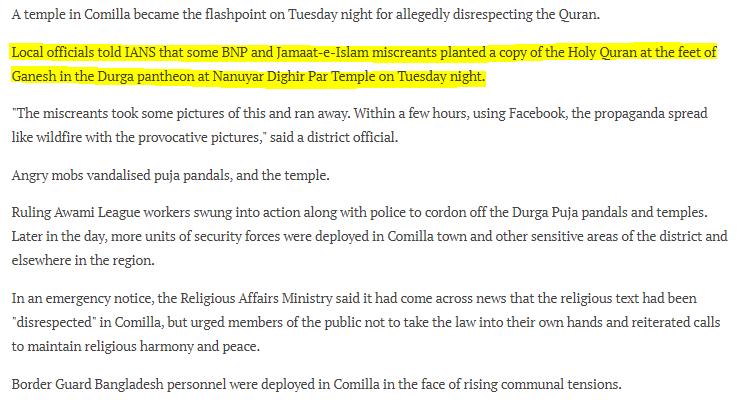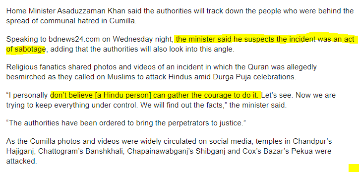 The Bangladesh Home Minister also asserts that the incident was sabotage because “no Hindu can gather the courage” to put Quran next to a “Hindu idol”. Courage?!