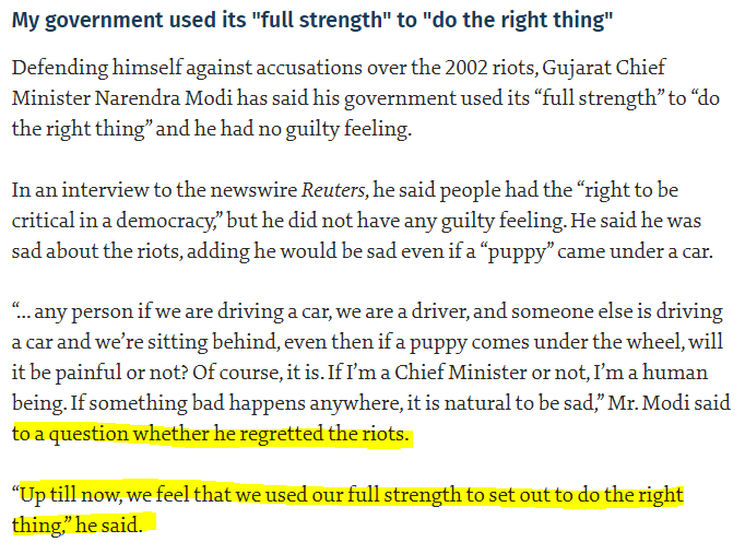 (Modi has never been formally charged and has said his government used its “full strength” to “do the right thing.”) (Source)