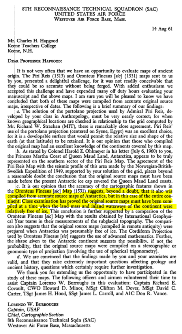 What they were saying was - the features on Antarctica shown on the Oronteus Finaeus map were identical to the ones that have been found via the seismic profile of the continent done by the Norwegian-British-Swedish expedition. So the United States Air Force office suggested that the Oronteus Finaeus map that was presented to them could only have been created when Antarctica was relatively free of ice.