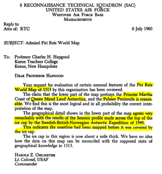 In 1960, Professor Charles Hapgood, of Keene College submitted the Piri Reis map to the US Air Force for their investigation and comments. This is the letter he received from them. (Source)