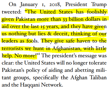 On January 1, 2018, President Trump tweeted: “The United States has foolishly given Pakistan more than 33 billion dollars in aid over the last 15 years, and they have given us nothing but lies & deceit, thinking of our leaders as fools. They give safe haven to the terrorists we hunt in Afghanistan, with little help. No more!”1 The president’s message was clear: the United States will no longer tolerate Pakistan’s policy of aiding and abetting militant groups, specifically the Afghan Taliban and the Haqqani Network. (Source)