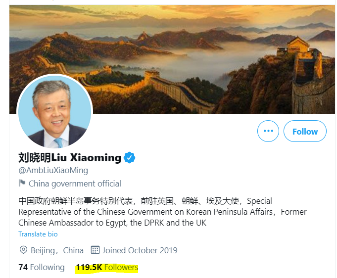 Chinese diplomats like Liu Xiaoming (Source), who stepped down from the ambassador position in the United Kingdom is one of the most vocal social media “wolf warrior”. He is now a Special Representative of the Chinese Government on Korean Peninsula Affairs. He now has over 199k followers on Twitter.