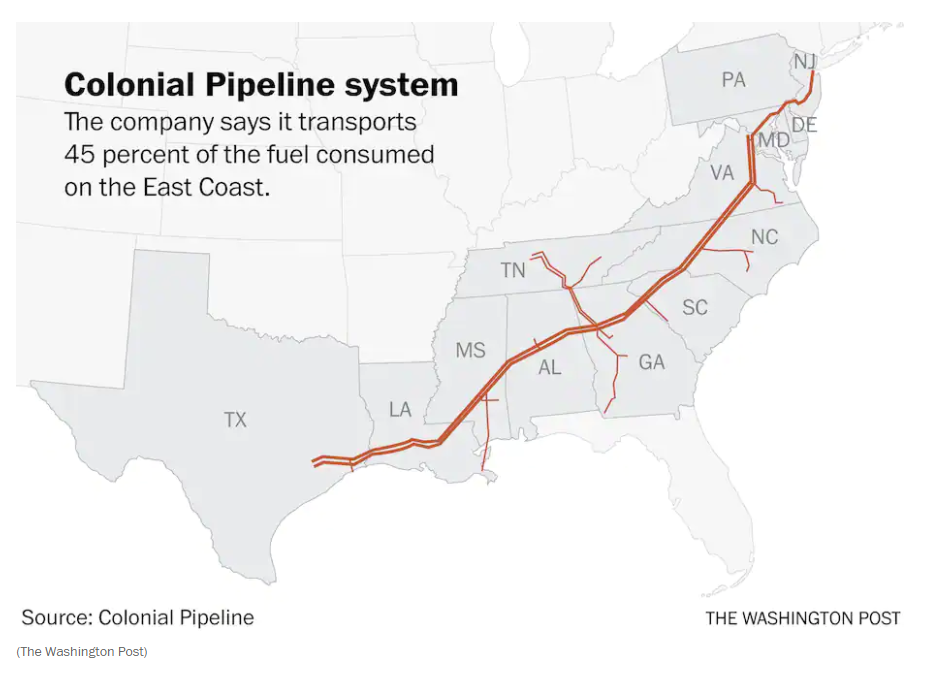 Colonial Pipeline Co., which delivers 45% of the gasoline and jet fuel supplied to the U.S. East Coast over a 5,500-mile pipeline has been subject to a ransomware attack.