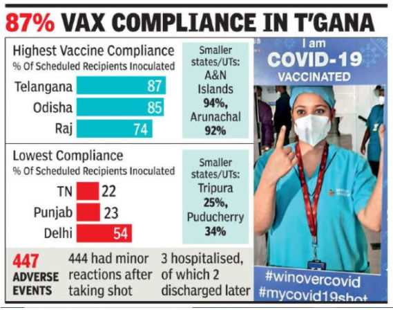 World’s largest Vaccine Drive: Around 64% of 3,16,375 planned beneficiaries were vaccinated on the first two days of the immunization drive against Covid-19 that was rolled out on Saturday, preliminary data from states, subject to further correction, compiled by the Centre till Sunday evening showed. Four states — Tamil Nadu, Punjab, Tripura, and Puducherry — recorded low turnout of beneficiaries in the range of 22-34%, whereas other states reported more than 50% attendance of those who were scheduled for vaccination on January 16 and 17. Assam, Delhi, and J&K reported 54% footfall. (Source)