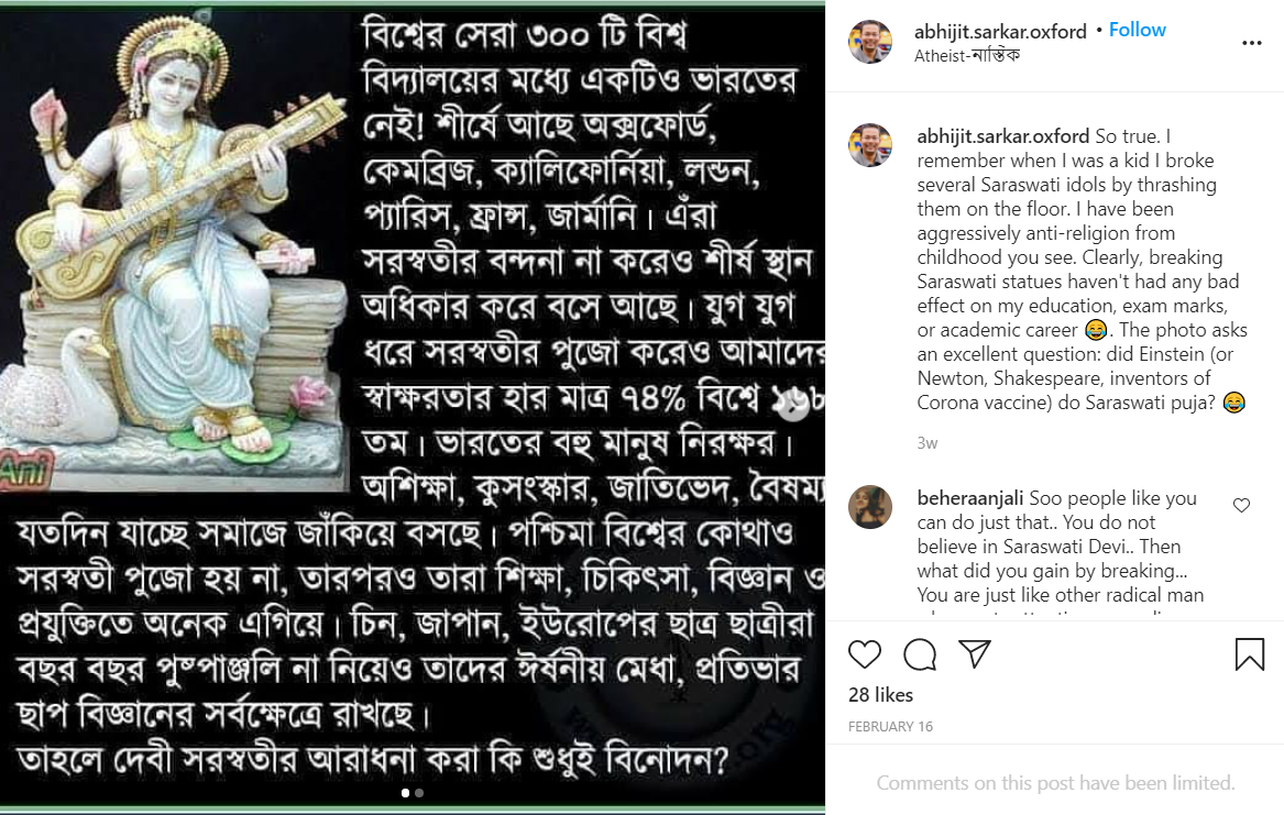 This is an entry in his Instagram handle. He is sharing why he used to break Saraswati idols and still was able to get great marks and academic credentials.