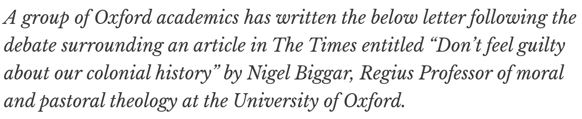 Now, Gilley found his most vociferous support from … well, Oxford. Nigel Biggar wrote a recent op-ed essay for The Times, defending Gilley and his narrative.