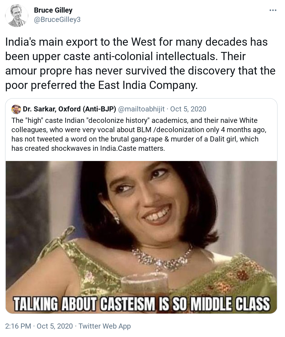 Are we just making up the shared ethos of Sarkar with the egregious group of Colonialism apologists? Let us check their public display of bonhomie over a deeply shared ethos - gaslighting “Upper Caste Indians writing against Colonialism.”