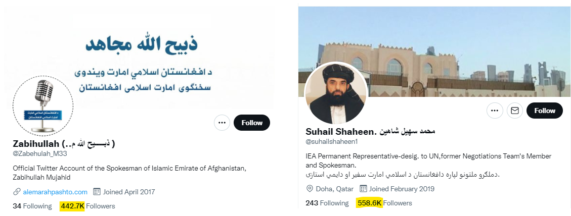 But Twitter allows Taliban representatives to share their narrative and create the halo of legitimacy. Specifically, when they have the following running into half a million followers each!