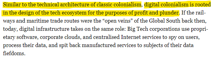 Yes, it is for-profit and economic gain. But that profit motive is not a stand-alone economics-inspired endeavor. It is a tool for a new colonial system, where imperialistic structures are being created in a new format. And probably even more overwhelmingly brutal. Michael Kwet (Visiting Fellow of the Information Society Project at Yale Law School), for example, writes in Al Jazeera about the neo-colonialism of the digital age.