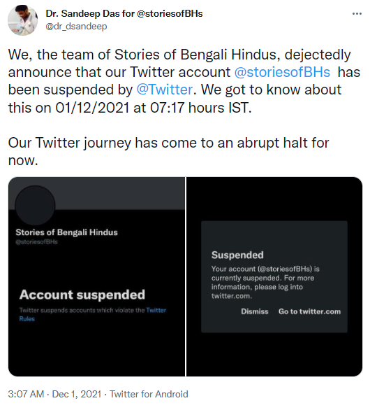 For example, when Hindus in Bangladesh were being targeted by Muslims there based on a fabricated set of events, the account of the group which was bringing the plight of indigenous Hindus to light was blocked and suspended by Twitter.
