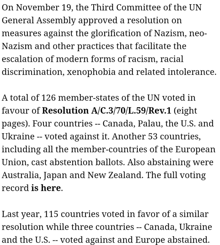 Because every year a UN resolution comes to the floor for voting. And for years, regularly 3 countries have voted against it. The US, Canada, and Ukraine.