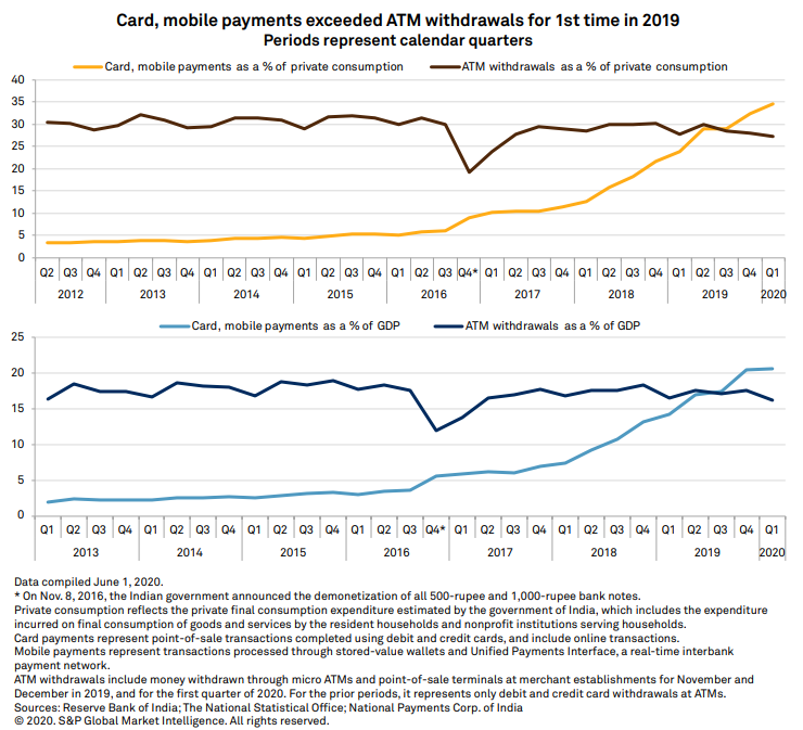 In the 2020 India Mobile Payments market report, S&P Global Market Intelligence shared an interesting graph showing how and when the mobile payments/cards starting really growing exponentially in India. (download the report from here - Source)