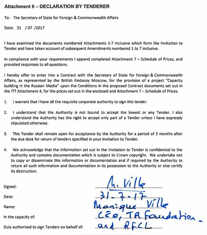 The FCO had sought out help in creating “a programme of themed tours to the UK by Russian journalists and online influencers.” So Reuters sent in a formal tender signed by Reuters CEO Monique Ville on July 31, 2017.