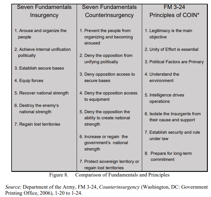 In a monograph by Major J. Scott LaRonde of the US Army (School of Advanced Military Studies, US Army Command, and General Staff College) (Source), the writer shares a very insightful table to show the strategies and counterstrategies in insurgency situations.