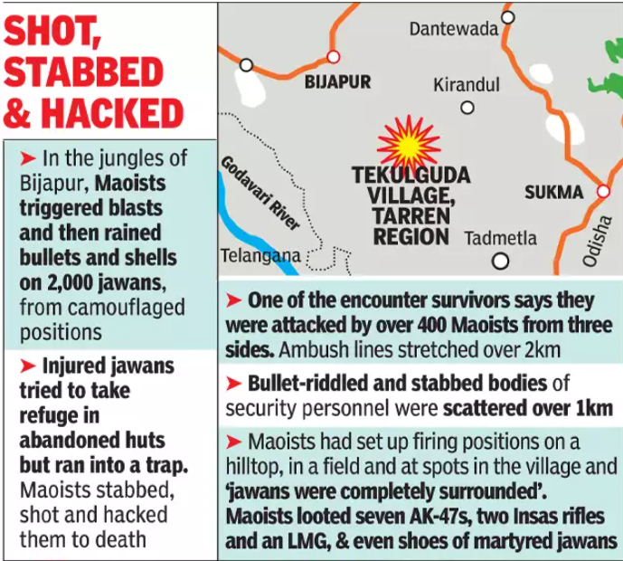 In Saturday’s ambush, Maoists triggered blasts and then rained bullets and shells on the troops from well-camouflaged positions, inflicting heavy causalities. One of the survivors of the encounter said that they were attacked by over 400 Maoists from three sides. The ambush lines stretched over 2km near Tekulguda village. Running gunfights broke out near Tekulguda, Jonaguda and Jeeragaon villages as the forces fought back hard to break out of the ambush. (Source)