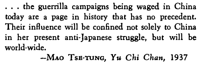 Mao is the master of war on insurgency, a style of warfare in which front lines and divisions between combatants and civilians are malleable. In insurgencies, the offensive and defensive tactics are less structured and the conflicts are often protracted, drawn out and designed to destroy the enemy’s will to fight. The aim is to create such disruption in the stronger, counterinsurgency force’s operating environment that the stronger force relents. In these cases, insurgent forces don’t necessarily have to win the war; they just don’t have to lose. However, in Mao’s case, eroding the “counterinsurgent’s” will to fight provides an opportunity to leverage conventional military tactics to defeat the stronger enemy outright. (Source)