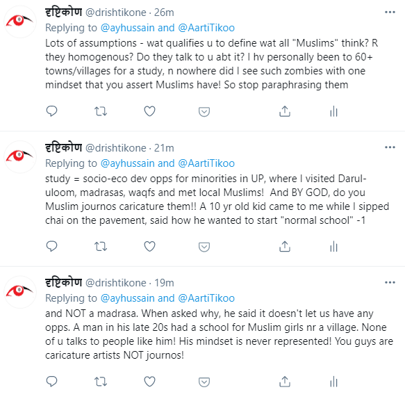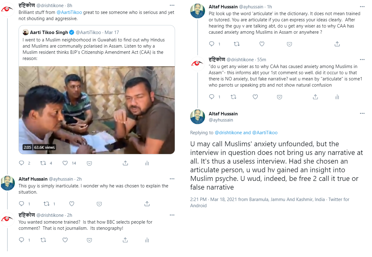 I retweeted Aarti’s tweet with my comment to which a journalist, who apparently has been BBC’s North India Correspondent replied. This started a conversation which is very interesting.