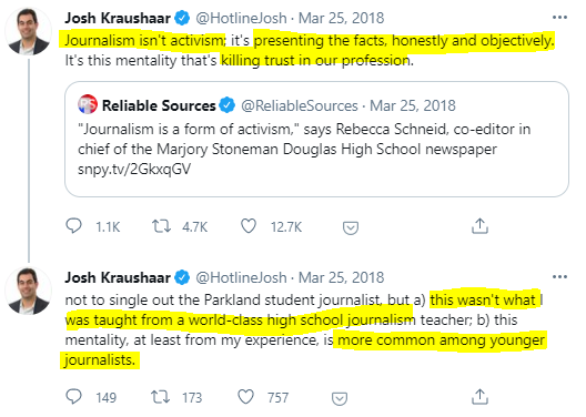Josh Kraushaar, a columnist at National Journal, made a comment on this quote from Rebecca and on the confusion amongst the journalists of today and their fetish with activism.