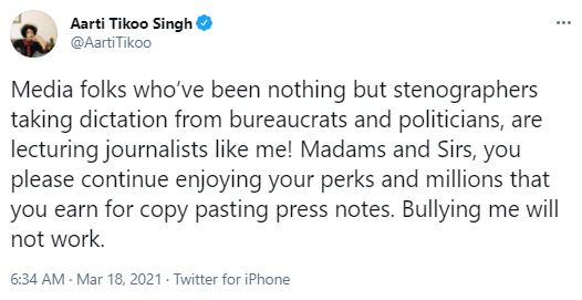 While many folks who had their journalism right praised Singh’s different, “old school” style of journalism, the “woke journos” got rattled. To which Aarti shared her tweet dismissing them the way they should have been.
