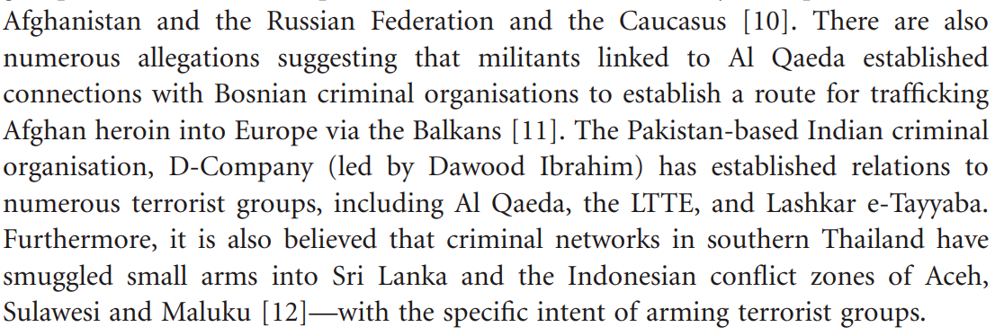 organized crime, ‘cooperation with terrorists may have significant benefits for organized criminals by destabilizing the political structure, undermining law enforcement, and limiting the possibilities for international cooperation.’ (Source)