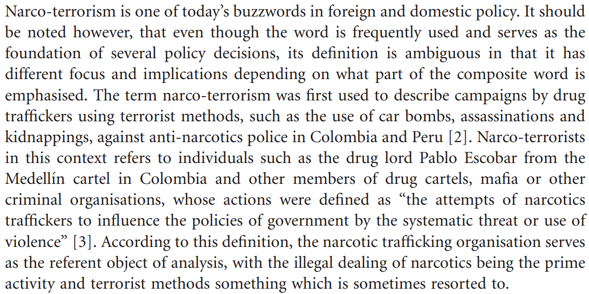 To fully understand the baggage that the word narcoterrorism carries along with it, once needs to understand its genesis. As Emma Björnehed, Associate Senior Lecturer at Swedish Defence University suggests, the word narcoterrorism originated while dealing with the Colombian drug cartels, which had larger ulterior designs. They wanted to pressurize and sometimes even usurp the government functioning and policies. The attacks on the government and use of extreme violent means like bombing etc started the terminology associated with terror. (Source)