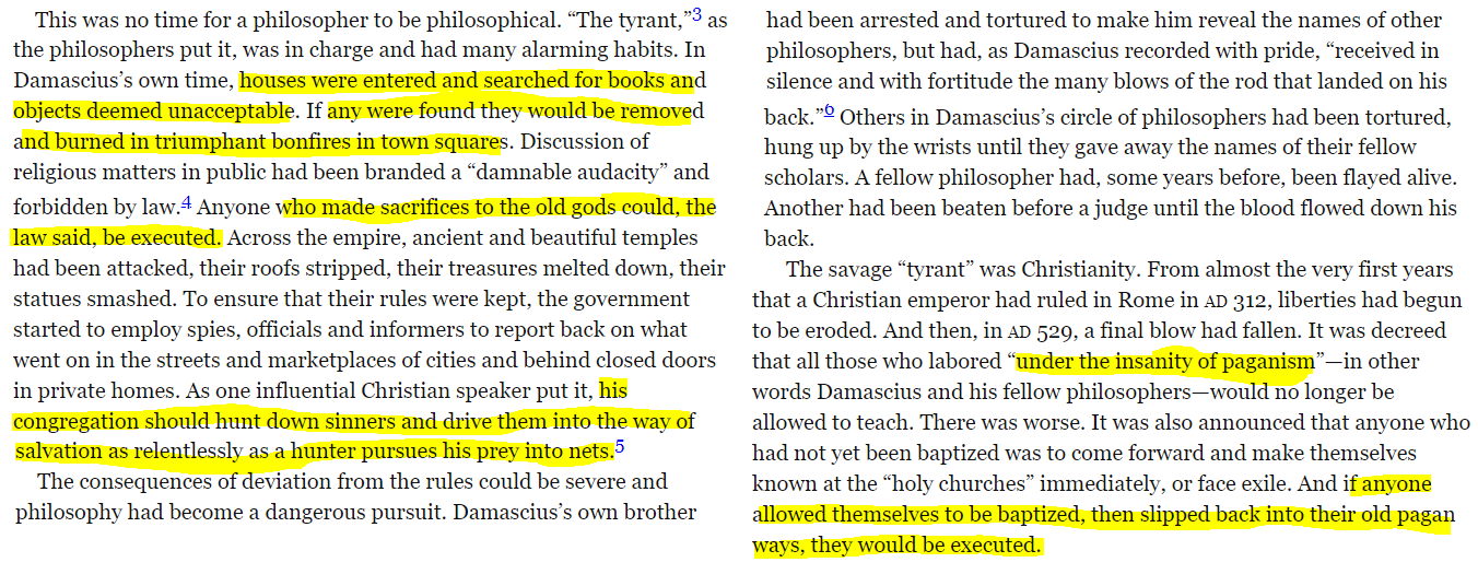 Catherine Nixey writes in “The Darkening Age: The Christian Destruction of the Classical World” about how systematically the Greek schools, libraries and scholarship were destroyed. In the very first chapter Nixey starts off with the march of Damascius, the leader at the most famous Greek philosophical school called The Academy, which traced its lineage to Plato, along with his students from Athens. They were the last ones left. The rest had been mercilessly destroyed.