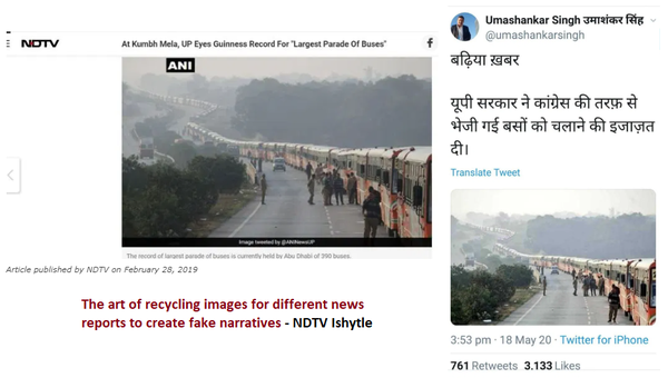 The sources of news and information in the mainstream media are also compromised. Here is an example of an image that went viral yesterday when an NDTV journalist shared it to show the buses that had been donated by the Congress for the UP migrants. Even when NDTV had used the same image during the kumbh at Prayagraj to talk about a Guinness world record!