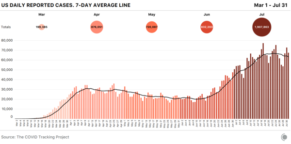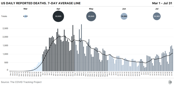 The dance of COVID continues in the US and keeps claiming more lives as the politicians bicker and play politics. As one can see - after a little dip, the cases have increased to a peak and show no sign of slowing down. (Source)