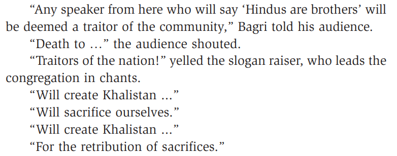 But this was not all. The Hindus, who had never targeted Sikhs (1984 was a massacre of one community - Sikhs - by one political party - Indian National Congress), were singled out for extreme hate and violence by Bagri.