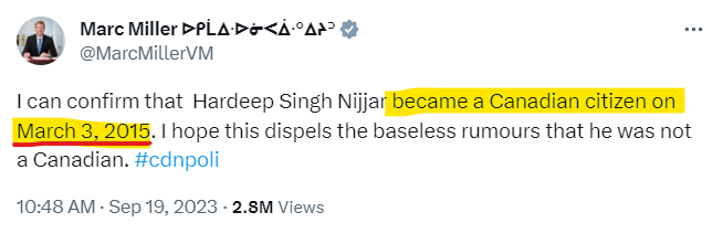 When some people argued about his citizenship, the Canadian Minister of Immigration, Refugees and Citizenship confirmed that Nijjar had become a Canadian citizen on March 3, 2015.