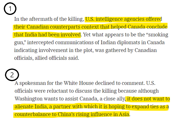 So we see that the US is coming behind Canada's claim and offering to buoy its rather pedestrian "open source public information" backup. And while the current US establishment is doing the dirty work for Trudeau's tantrum play, it is also hopeful that it will be able to "use India as a bulwark against China".