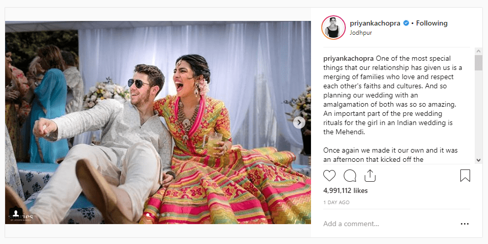 Per People, “It is super important to Priyanka to have an Indian ceremony that honors her heritage and culture, just as it’s important to also have a Western ceremony that honors Nick’s Christian upbringing. They are doing both.” (Source)