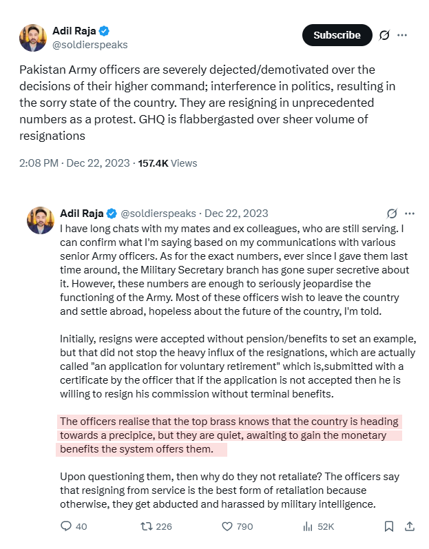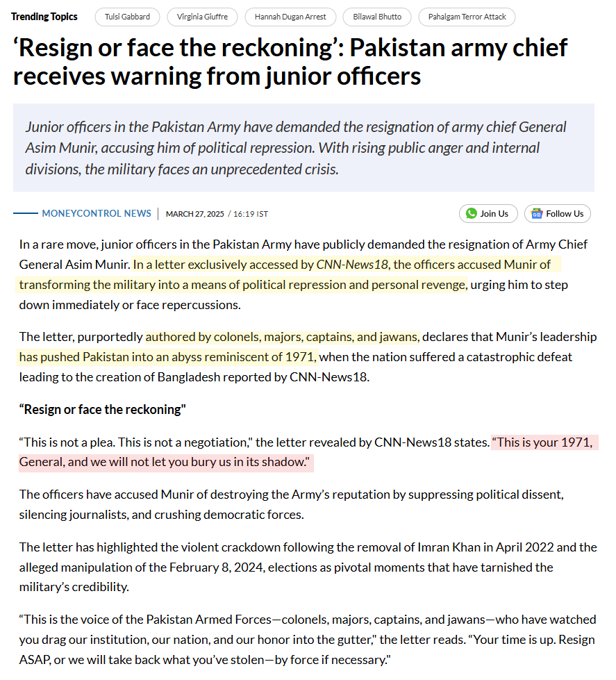 In March 2025, the trust in Army leadership is so low that the junior officers are openly writing to the Army chief to resign.