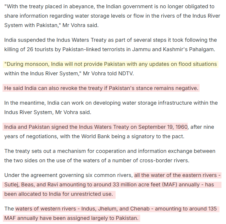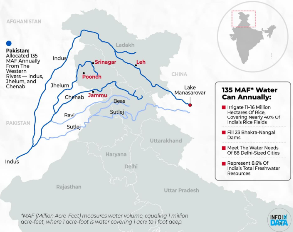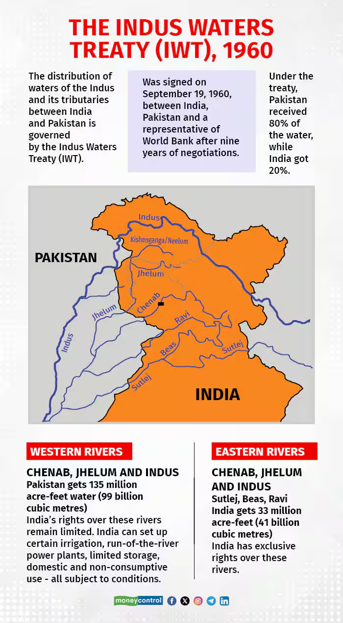 - On Wednesday, India announced a raft of measures against Pakistan, including the suspension of the Indus Waters Treaty. The Indus Waters Treaty, brokered by the World Bank, has governed the distribution and use of the Indus river and its tributaries between India and Pakistan since 1960. The Indus river system comprises the main river, the Indus, and its tributaries. The Ravi, Beas, Sutlej, Jhelum and Chenab are its left-bank tributaries, while the Kabul river, a right-bank tributary, does not flow through Indian territory. The Ravi, Beas, and Sutlej are collectively referred to as the eastern rivers, while the Indus, Jhelum, and Chenab are known as the western rivers. The water of this river system are crucial to both India and Pakistan. The Indian government said it will remain suspended unless Pakistan credibly and irrevocably stops support for cross-border terrorism.