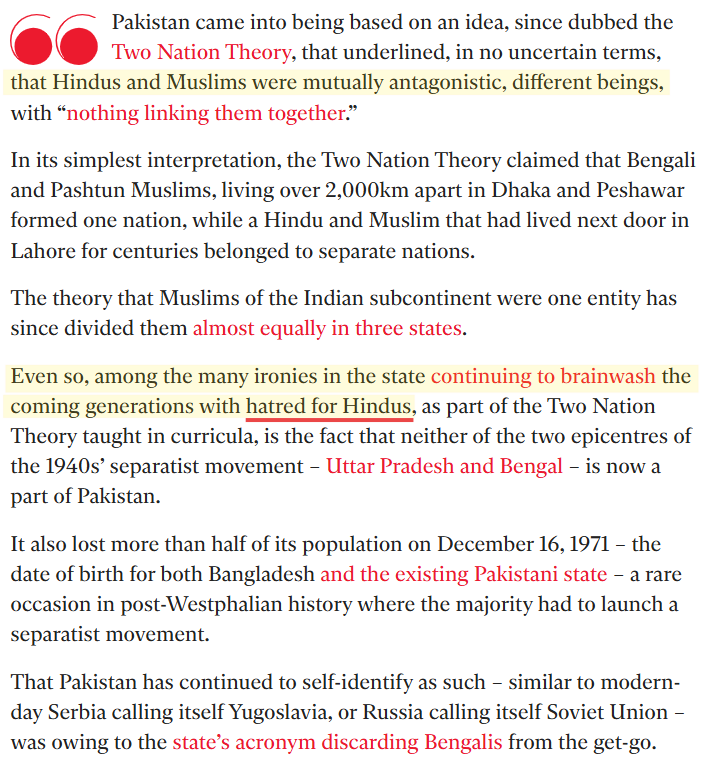 As Kunwar Khuldune Shahid journalist from Lahore wrote in "The Independent", the two-nation theory was the basis of deeply embedded hatred for Hindus in the psyche of the Pakistanis.