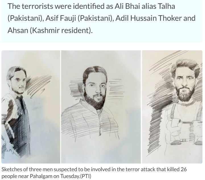 In a major breakthrough, the Jammu and Kashmir Police on Thursday released sketches of three individuals suspected to be behind the recent terrorist attack in Pahalgam that claimed the lives of 26 civilians. Two of the suspects have been identified as Pakistani nationals. Authorities have announced a reward of ₹20 lakh for credible information leading to their capture.