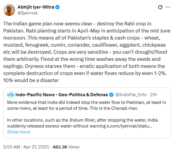 Abhijit Iyer-Mitra discusses the possible game plan of the Indian government in terms of aggressive actions against Pakistan. Remember, flooding also disrupts and damages the topsoil for two to three years, further crippling agricultural productivity.