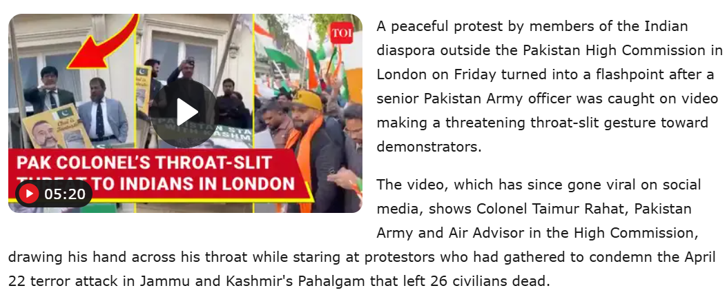When Indians went to demonstrate against the terror attack in front of the Pakistani consulate in London, Colonel Taimur Rahat, the Pakistan Army and Air Advisor at the consulate made insolent throat slitting action.