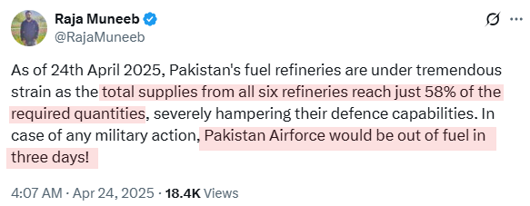 As per a Pakistan-watching journalist, Raja Muneeb, Pakistani refineries can only supply 58% of the countries needs. Given such a situation, the Pakistan Air Force will be out of fuel in three days!