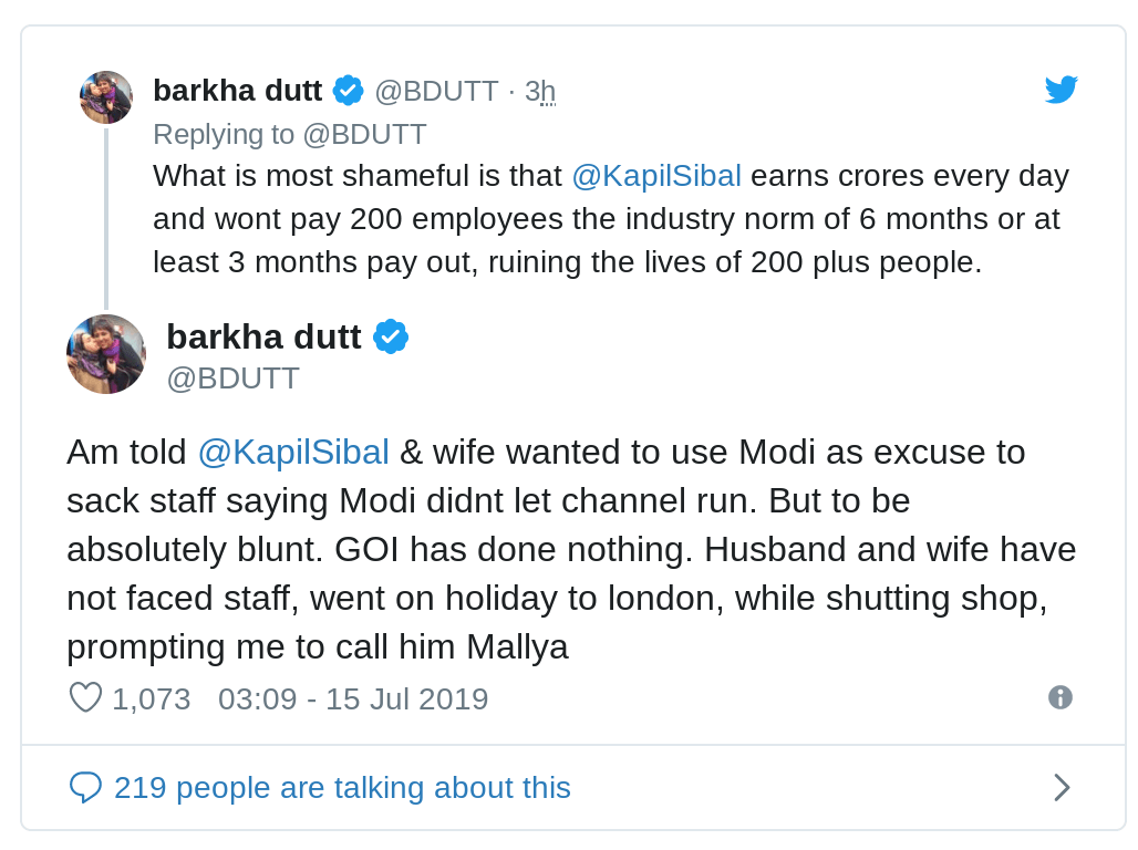 - Kapil Sibal and his wife wanted to blame Modi and his government saying that they did not let the channel run. But Dutt clarifies that GOI has done nothing for the failure of the channel. Sibals have been holidaying in London, refused to meet the staff while shutting shop!