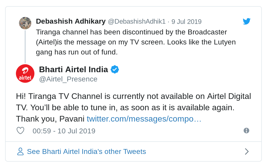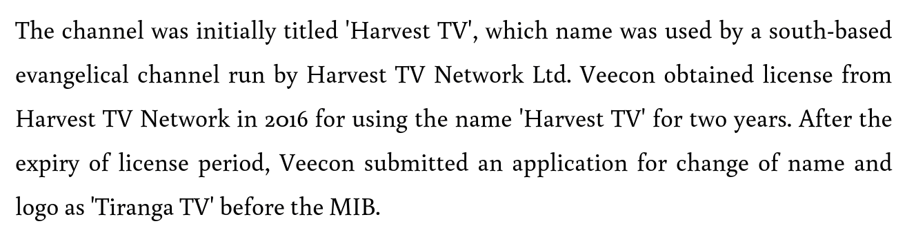 The name change was also a major issue since the Union Ministry of Information and Broadcasting had disallowed Veecon Media and Broadcasting Private Ltd to use “Tiranga” (since no national symbols can be appropriated by private businesses). In any case, Telecom Disputes Settlements and Appellate Tribunal (TDSAT) over-ruled the Government and allowed Sibal owned Veecon that name.