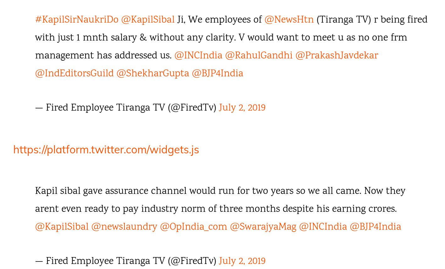 Modi-bashing Journalists Cheated by Modi-hater Kapil Sibal and Tiranga TV as the channel goes off air